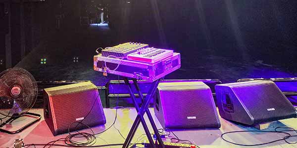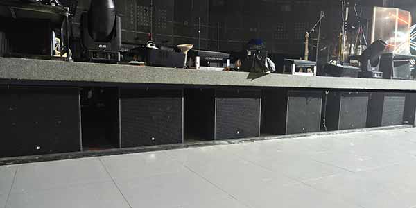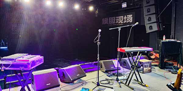 現場擴聲選用的是美真音響品牌,主擴使用的是MiniRay3C線陣列全頻音箱,搭配M28S雙十八寸超低音箱,12AM單十二寸作為舞臺返送音箱。